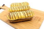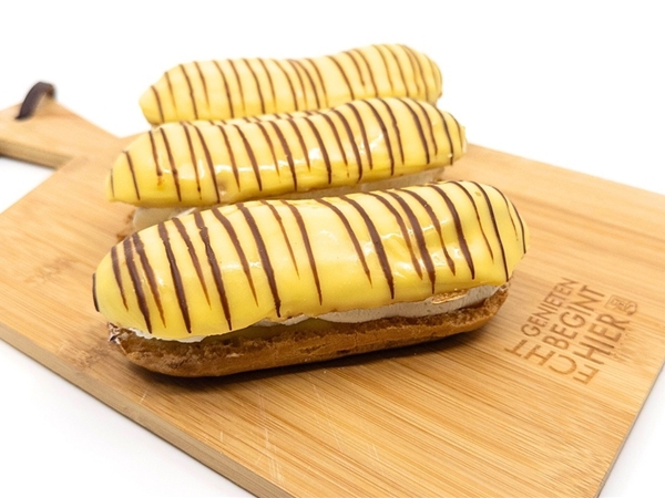 Een luchtige lange soes, overgoten met gele fondant, gevuld met gele room, schijfjes verse banaan en verse slagroom. Afgewerkt met een chocoladelijntje…. Ouderwets lekker!
