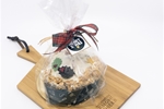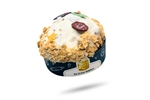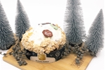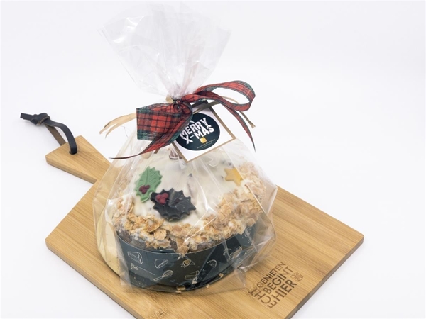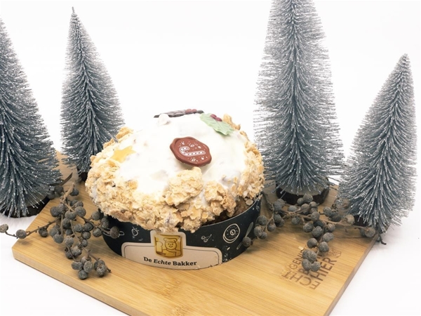 Zacht ‘Cakebrood’ met stukjes appel, hazelnoot, suiker en subtiel kaneelgranules, overgoten met een vanilletopping en kerst gedecoreerd.