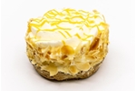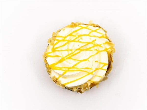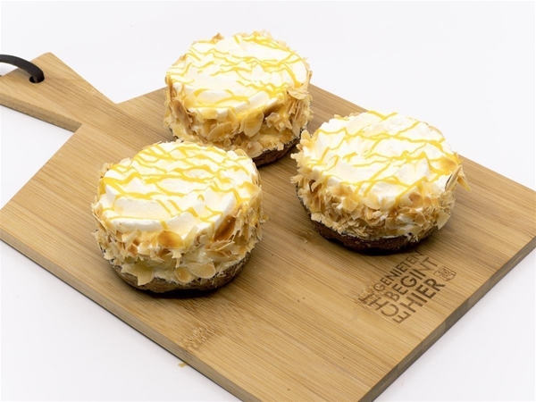 Harde wenerbodempje, bedekt met zalige advocaatbavarois, aangezet met amandelschaafsel… Mmmm!